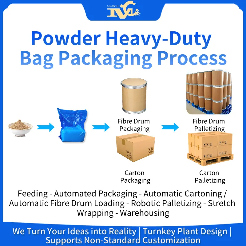 Maichi is a professional manufacturer of Fully Automatic Powder Heavy-Duty Bag Packaging Lines. Our systems are designed to be dust-free and achieve high-precision packaging. We customize packaging line equipment based on the unique characteristics of each material, offering one-to-one customized services. With 26 years of packaging industry experience, we empower manufacturing enterprises to reduce costs, improve efficiency, and increase production capacity.